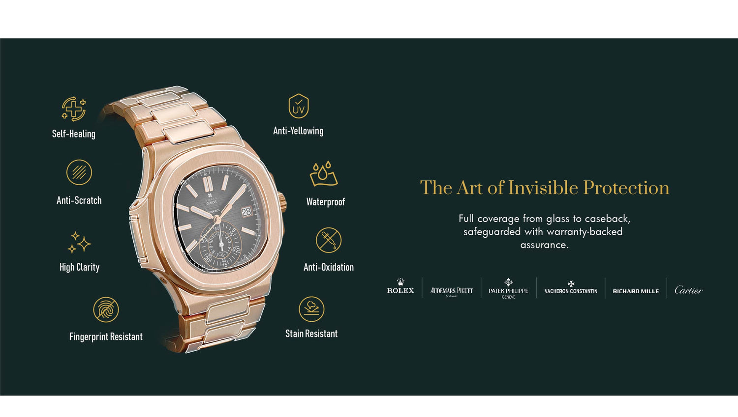 Installation of seamless, full-coverage protective film for luxury timepieces. With high-quality materials and precise craftsmanship, we protect every detail — preserving the refinement and beauty of your watch.